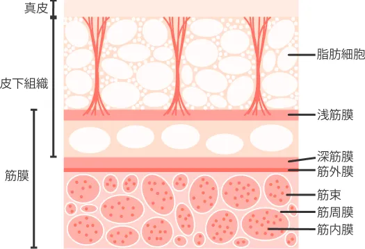 筋膜は、コラーゲンやエラスチンといった線維性たんぱく質と水分からなる網目状の組織で構成され、独特のバランスを保っています。これにより、多方向に伸縮しながらも、張力を保って姿勢や骨格を支える力を発揮しています。また、筋膜には筋肉の数倍を超える感覚受容器があるとされています。