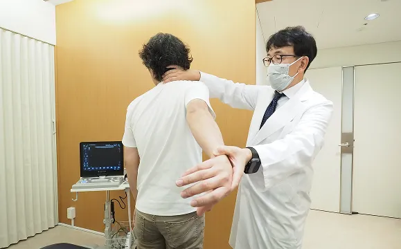 ハイドロリリースは、「どこに、なぜ打つか」を的確に判断する精度の高い施術です。まず、患者様の「困っている動き」や「痛みの出る瞬間」を丁寧にヒアリングし、実際の動作を評価。そのうえで、熟練の触診技術で筋膜や神経の滑走障害部を正確に特定します。注射は生理食塩水を通常1〜2ccずつを5〜6カ所に分けて注入。ハイドロリリース注射は広く行われていますが、単に疼痛部位だけでなく、痛みの原因となる機能不全を複数箇所みつけ、機能不全を改善することで、集約的に治療を行います。